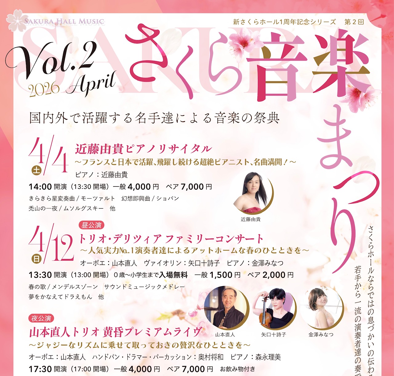 メインイベントとしまして、桜の咲く時期に「さくら音楽まつり」(旧 さくら音楽週間)を開催し、プロの素晴らしい演奏者の皆さまの生演奏を幅広い年齢層の皆さま、また遠方からも足をお運びいただき身近にお楽しみ頂いております。